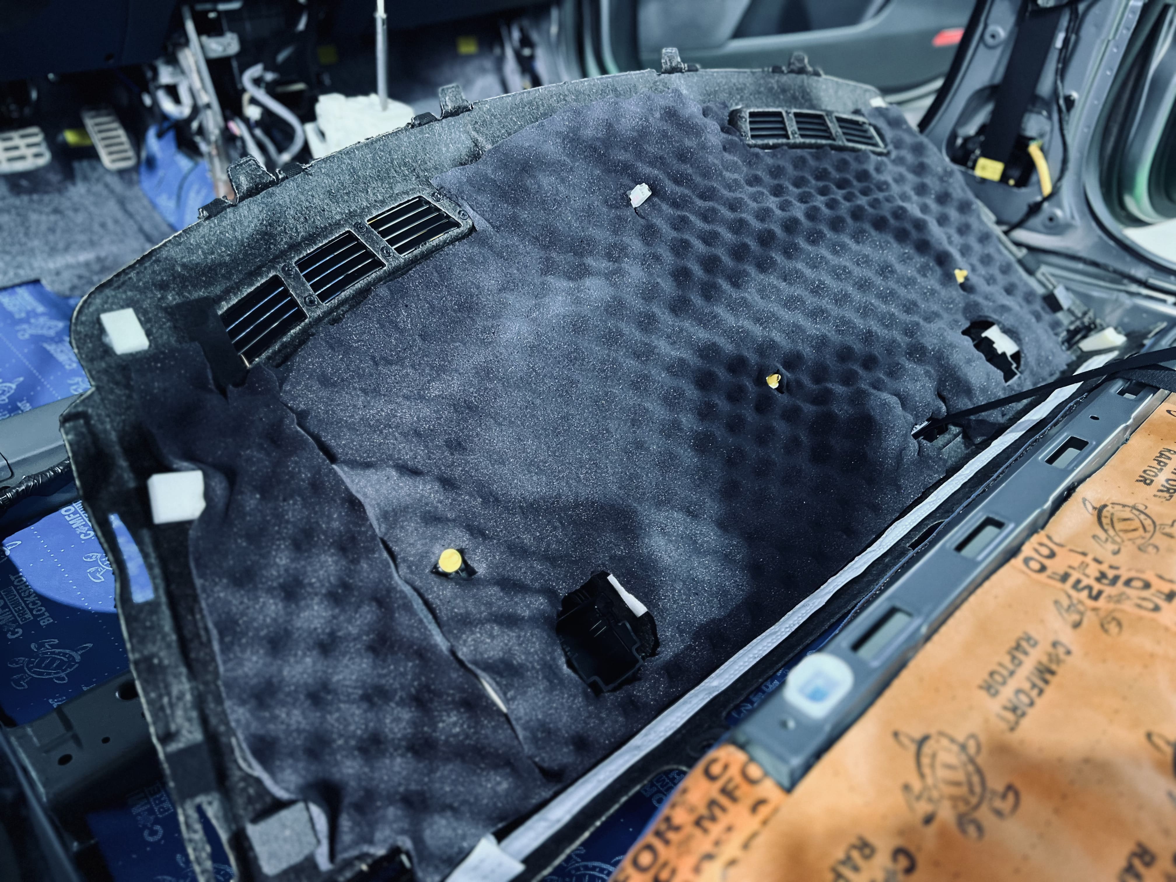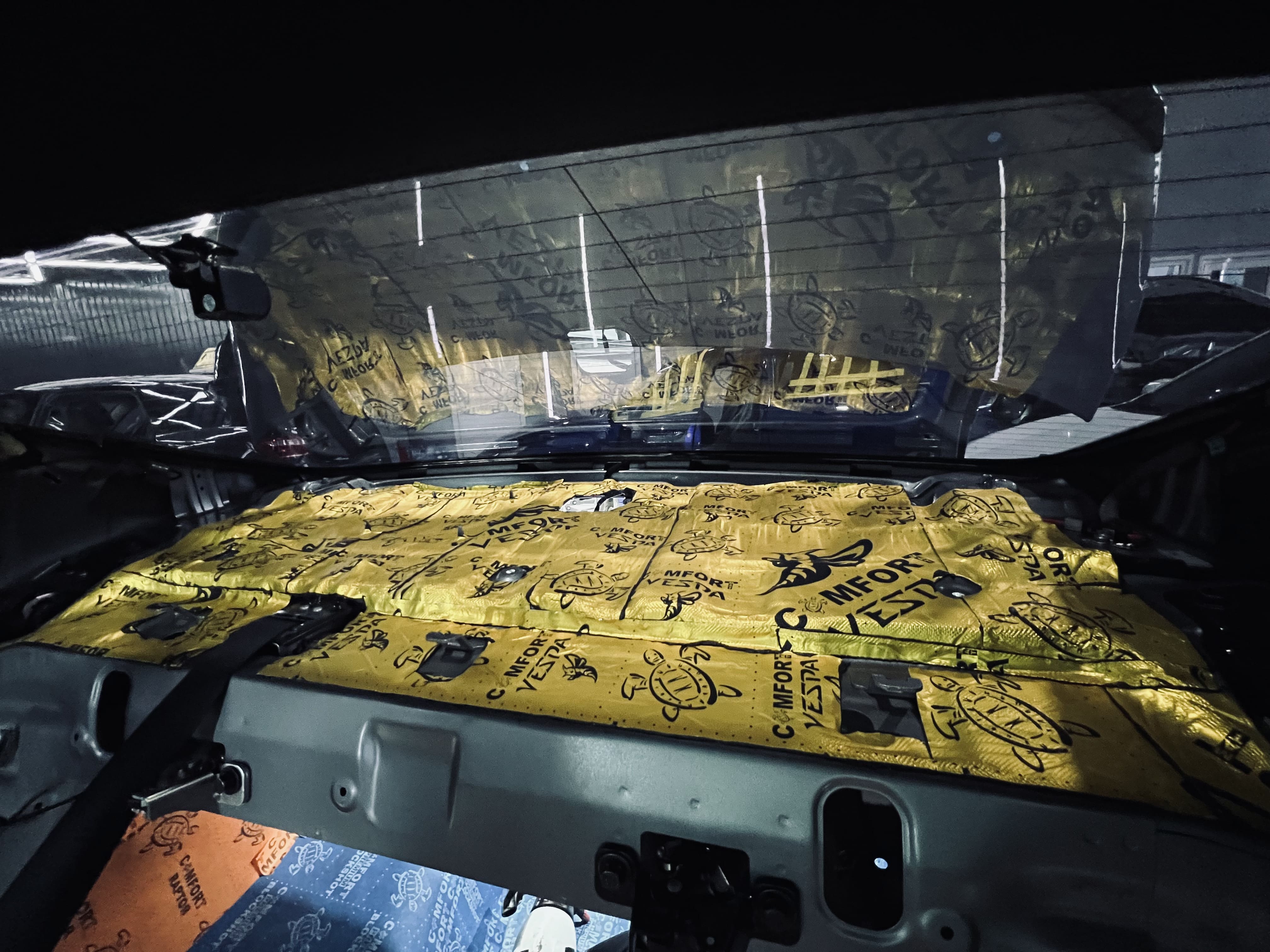 Зона над багажным отсеком также была обработана для дополнительного снижения шума. Мы применили комбинацию вибро и шумоизоляционных материалов.